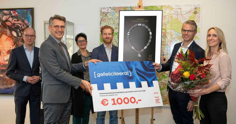 [foto: v.l.n.r. wethouder Joost Hendriks, waarnemend burgemeester Wim Hillenaar, raadslid Corine Jeckmans, raadslid Thomas van der Meer en de winnaars Paul de Haas en Hester Vonk Noordegraaf]
