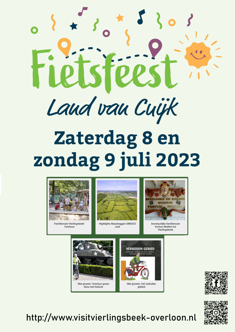 Op 8 en 9 juli organiseert Visit Vierlingsbeek & Overloon in samenwerking met Visit Land van Cuijk het Fietsfeest Land van Cuijk 2023. In heel land van Cuijk zijn een 14-tal routes te fietsen langs natuur, cultuur en diverse activiteiten.