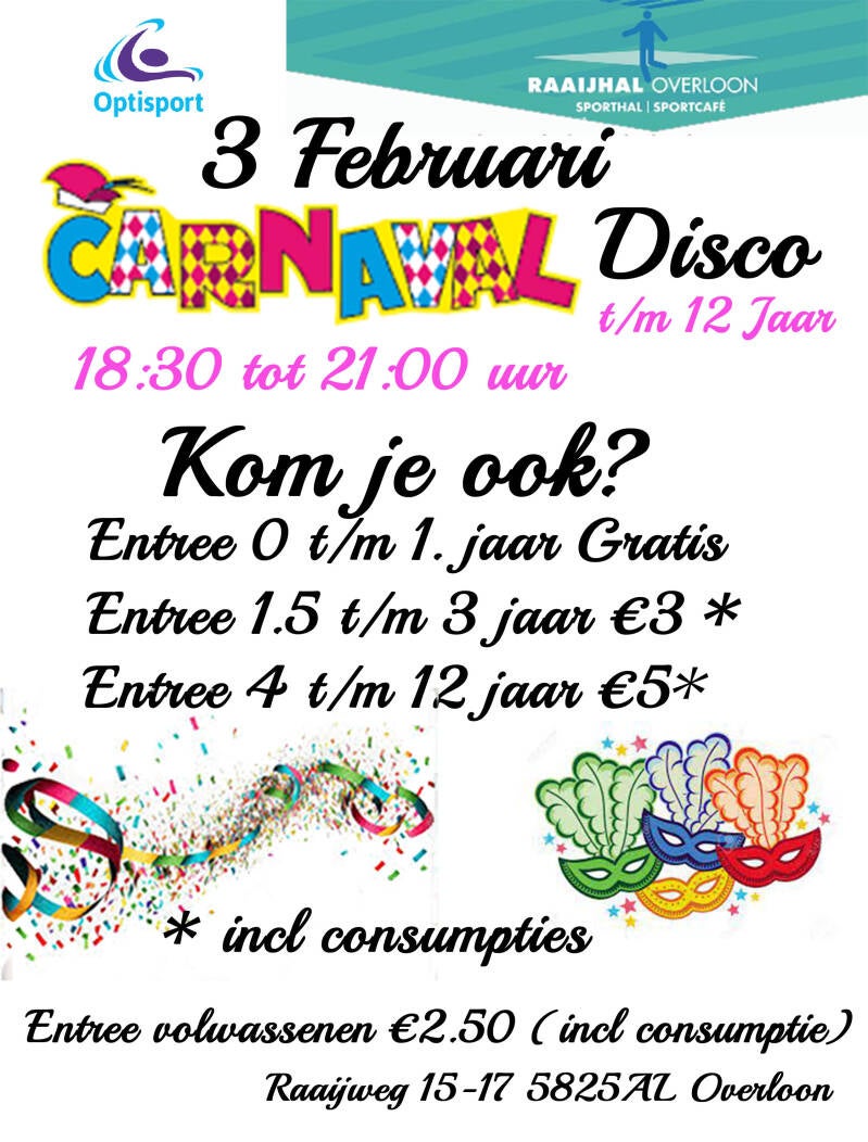Op 3 februari is het tijd om je mooiste, leukste of gekste kostuum uit de kast te trekken en naar de Raaijhal te komen voor de Carnavalsdisco!