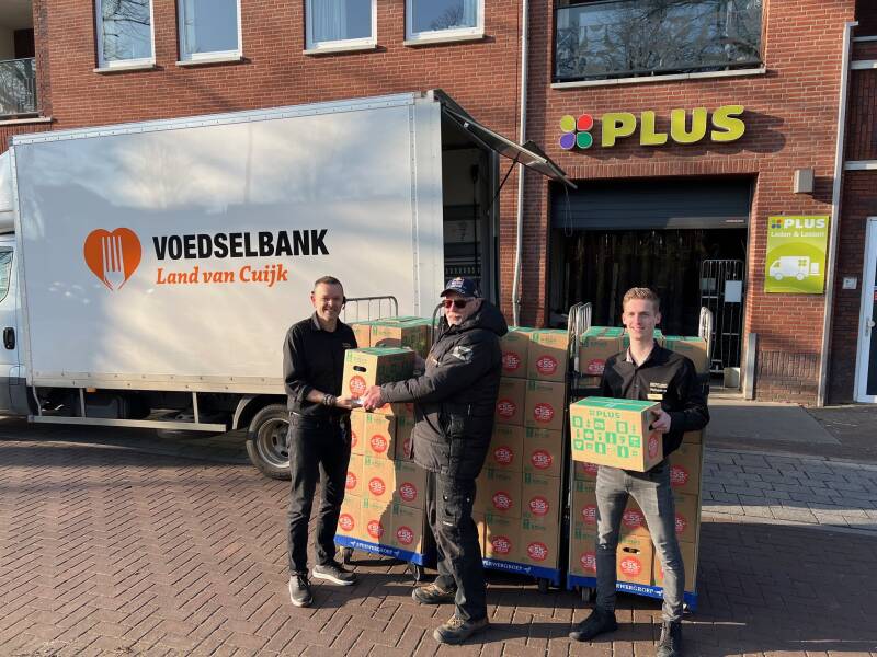 Foto: Ton en Niels van PLUS Verbeeten overhandigden de pakketten aan de vrijwilligers van Voedselbank Land van Cuijk