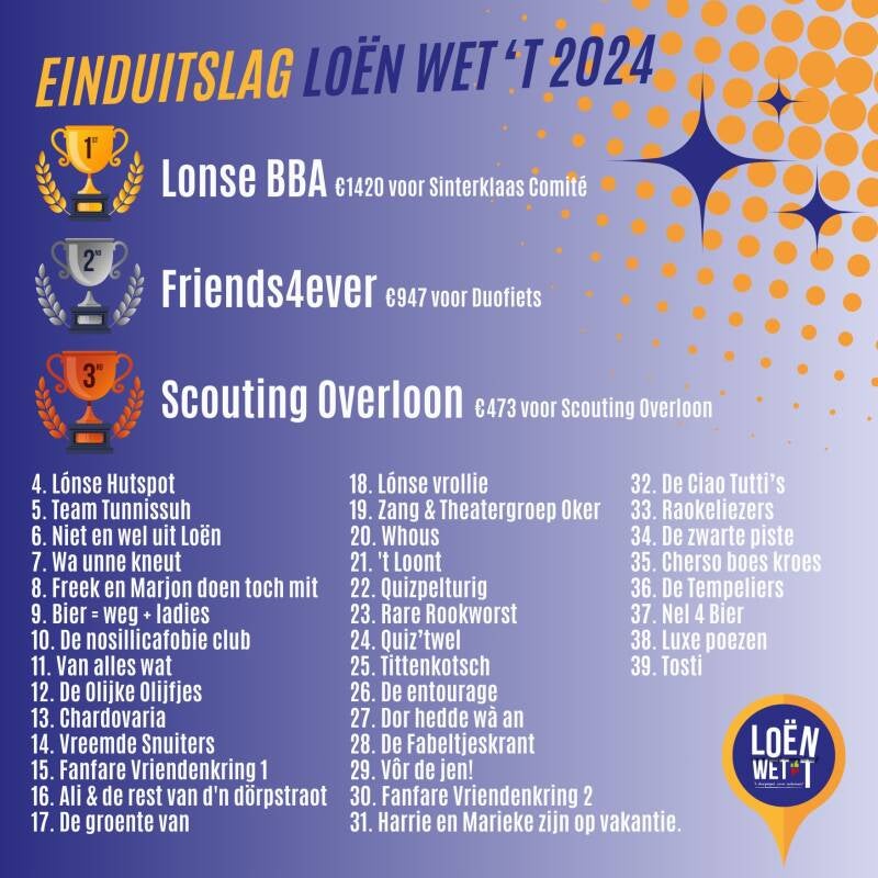 Deze vijfde editie van Loën wet 't is een feestelijke mijlpaal voor dit levendige dorpsspel, dat de gemeenschap van Overloon al jaren bij elkaar brengt. Met enthousiaste deelnemers, een genereuze sponsorbijdrage en een feestelijke prijsuitreiking heeft Loën wet 't opnieuw bewezen een onmisbaar evenement te zijn in de Overloonse gemeenschap.