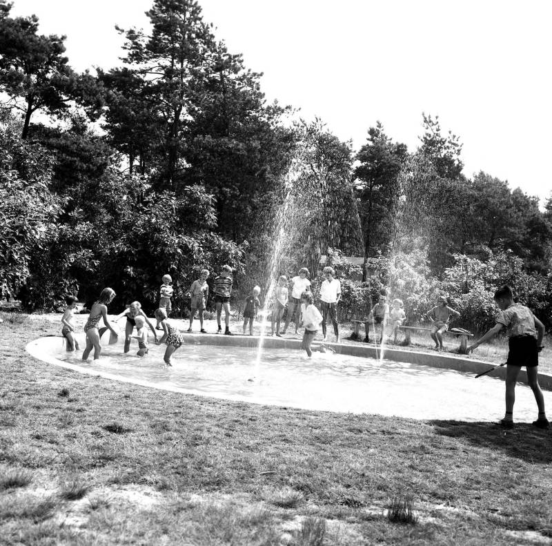 Het zal warm zijn geweest, die dag. Kinderen zoeken verkoeling in deze fontein in Overloon. Badpak of niet, nat worden ze toch wel. Deze foto moet in Overloon gemaakt zijn, maar waar of wanneer weten we niet. Kun jij ons helpen?