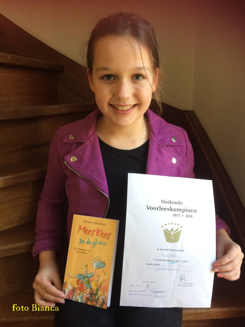 Isabel Gerrits (9 jaar) is vandaag 24 november 2017 tijdens een spannende voorleesbattle de voorleeskampioen 2017/2018 van de Josefschool in Overloon geworden.