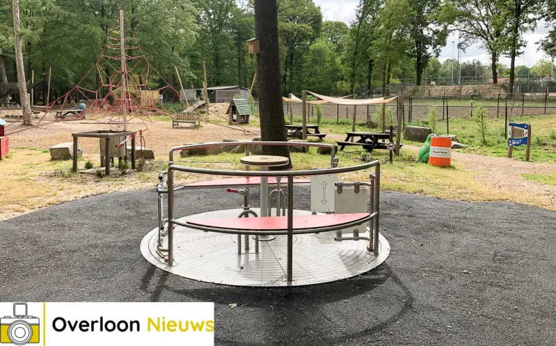grote groep kinderen op de draaimolen. Helaas bleek deze draaimolen daar niet tegen bestand. Ondertussen hebben wij een hufterproof vervangend inclusief toestel gevonden, zie filmpje.