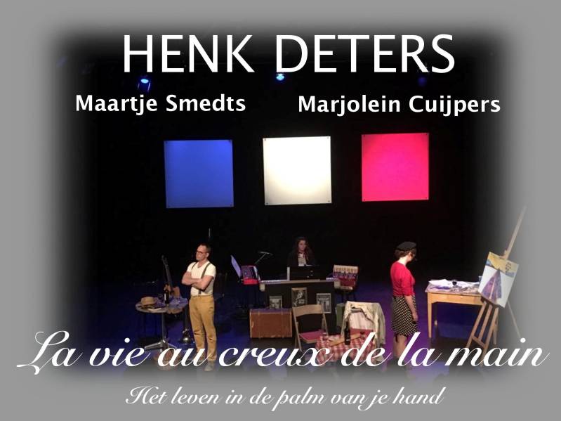 La vie au creux de la main - Het leven in de palm van je hand met Henk Deters, Maartje Smedts en Marjolein Cuijpers Een prachtige voorstelling in een sfeervolle ambiance Marjolein, Maartje en Henk nemen u mee op een theatrale reis naar het land van brood, kaas en wijn. Volg het leven van een kunstenaar, vol drama, passie en romantiek.
