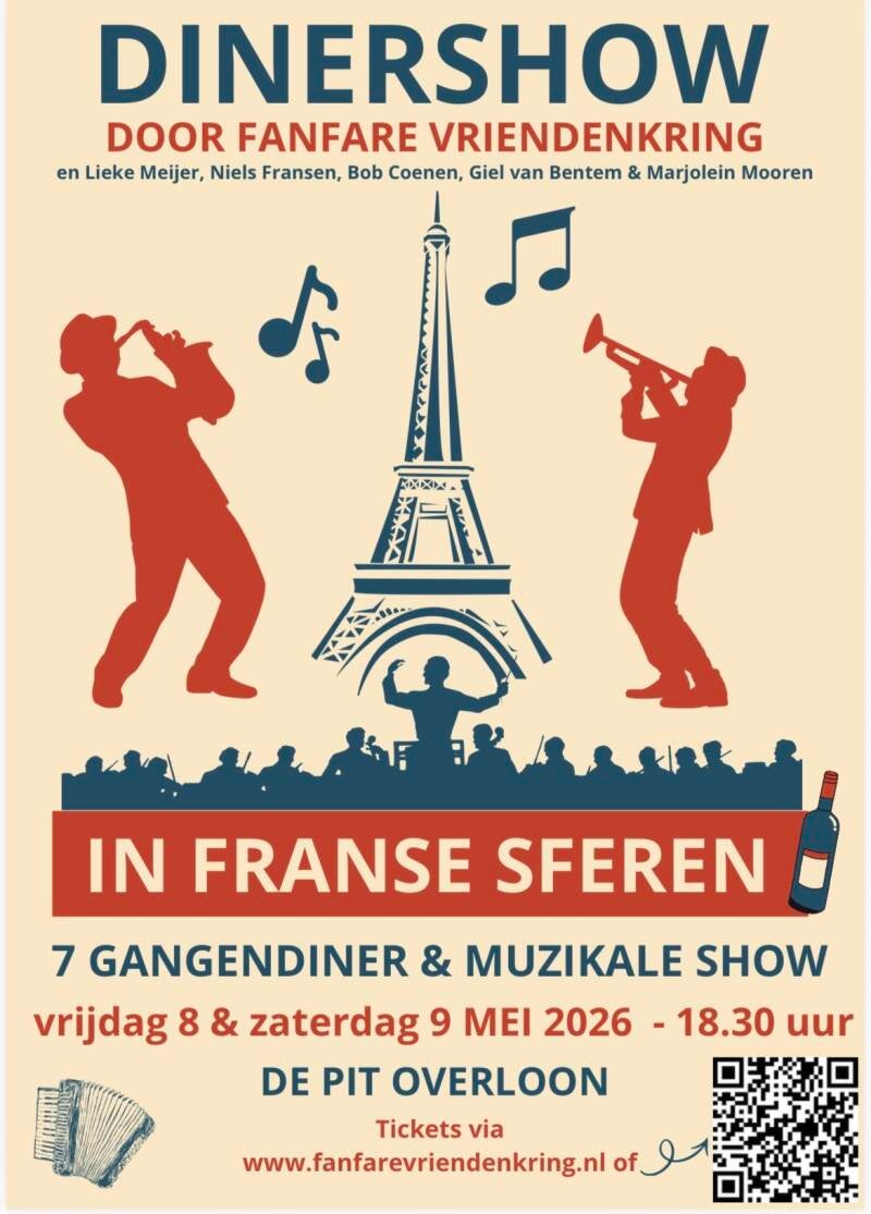 Fanfare Vriendenkring organiseert twee bijzondere avonden op vrijdag 8 mei en zaterdag 9 mei in de Pit in Overloon een dinershow in Franse sferen! Geniet van prachtige muziek, dans, zang en chansons, gecombineerd met een verrassend 7-gangen diner verzorgd door Manolito en zijn team!