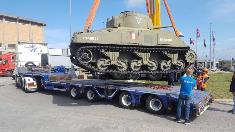 Op donderdag 11 april is de Sherman op de dieplader geplaatst in Ortona en deze zal naar verwachting vijf dagen later arriveren in Overloon.