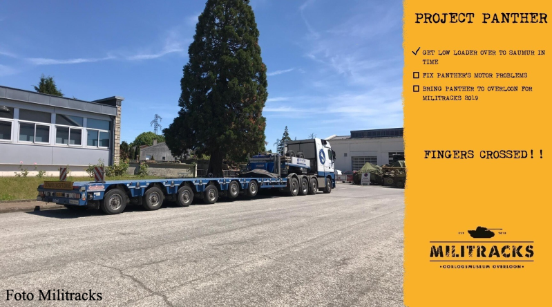 De dieplader arriveerde in Saumur.Of de Panther kan worden geladen,hangt nog steeds af van een aantal technische problemen die de tank heeft.Ze werken er heel hard aan; laatste controles moeten worden uitgevoerd voordat daadwerkelijk laden kan plaatsvinden.Vingers gekruist mensen! Bron:Foto Militracks