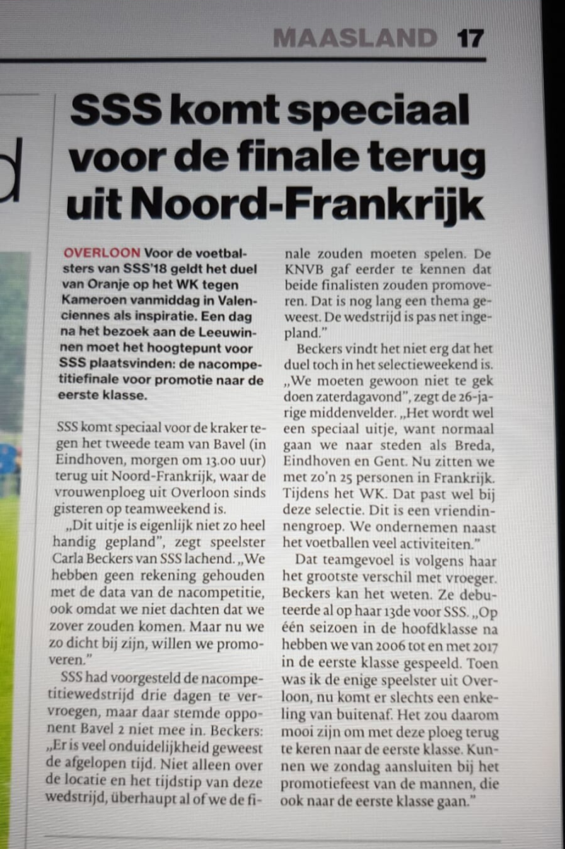 Vrouwen 1 speelt zondag om 13.00 uur in Eindhoven (Sportpark de Leeuwenkuil, Amstelstraat 1A te Eindhoven) de finale voor promotie naar de 1ste klasse. Mocht Vrouwen 1 promoveren dan worden Heren 1 en Vrouwen 1 gezamenlijk gehuldigd zoals bovenstaand beschreven. Wij wensen onze Vrouwen uiteraard heel veel succes toe voor komende zondag. Uw support hierbij is van harte welkom. meer informatie over de huldiging vind je op de website https://www.sss18.nl/ facebook https://www.facebook.com/rkvvsss18