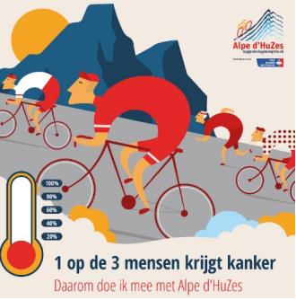 Alpe d’HuZes is een uniek sportief evenement waarbij zoveel mogelijk geld wordt ingezameld voor onderzoek naar kanker en naar verbetering van de kwaliteit van leven van mensen met kanker. Op één dag beklimmen 5000 deelnemers fietsend, hardlopend, of wandelend maximaal zes keer de Alpe d’Huez, onder het motto ‘opgeven is geen optie’.