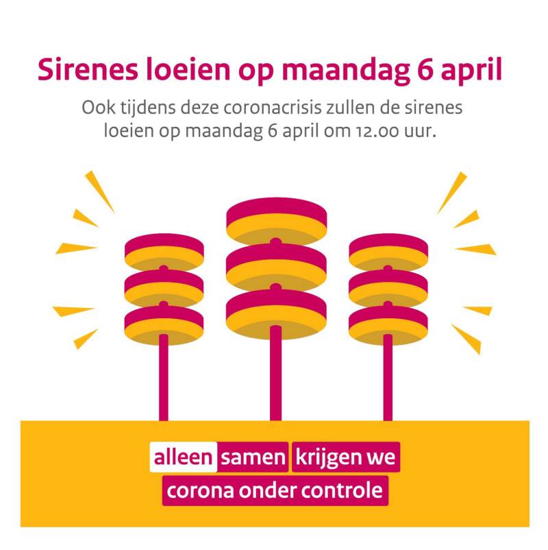 Iedere eerste maandag van de maand om 12.00 uur loeien alle 4278 sirenes in Nederland. Ook tijdens deze coronacrisis zullen de sirenes loeien op maandag 6 april om 12.00 uur.
