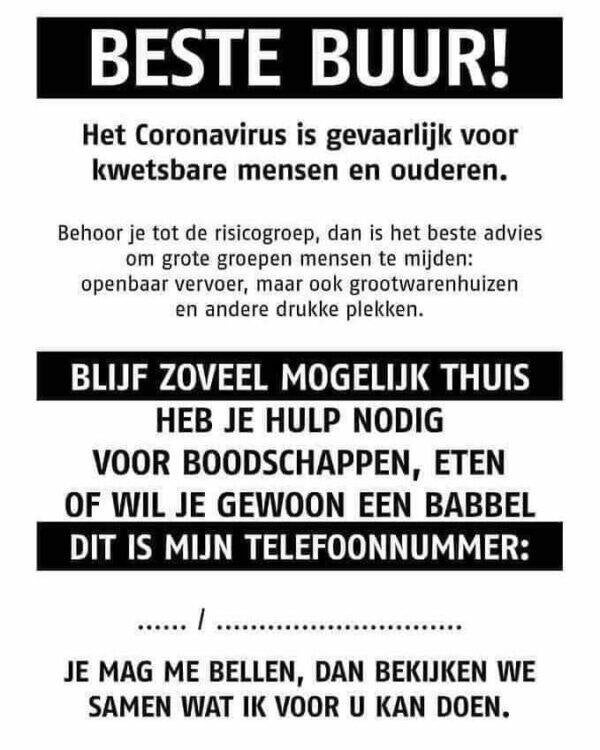 Doe een briefje bij een kwetsbare buurman- of buurvrouw in de bus met jouw naam en telefoonnummer, en geef aan dat je wil helpen