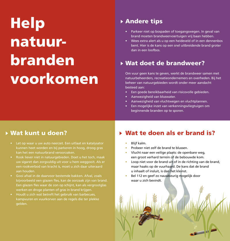 - Veroorzaak niet per ongeluk een natuurbrand: gooi daarom sigaretten en glas altijd in een prullenbak of neem het mee. Parkeer je auto (met hete katalysator) niet in hoog en droog gras.