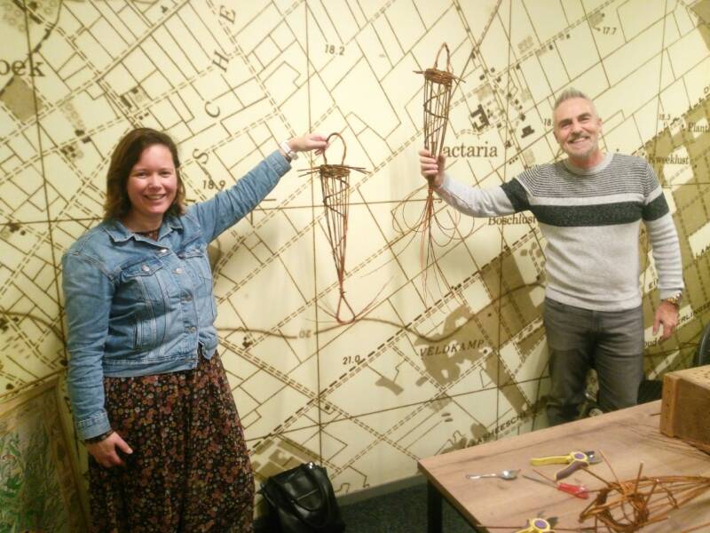 met het creatief vlechten met wilgentenen.Roel Verheggen en Caroline Ermers, zangeres bij Angels Rule hebben een mooi vogelvoedermandje gevlochten.