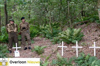 After that, the entire group, 30 people, was picked up by Dodges and Jeeps, military vehicles from the Second World War, for a battlefield tour, the exact last part of the route that Wil van der Burgt and the Royal Ulster Rifles took to Overloon and Venray in 1944. The battlefield tour, with explanations at various locations along the way, ended with a short hike to the edge of the forest where Van der Burgt and the 6 Brits were temporarily buried. Janssen: "A few months ago, members of the foundation succeeded in accurately determining where those temporary graves were located via GPS provisions and comparison of old maps and photos on the meter. Now at this stage of the memorial day, we have placed 7 replica crosses to mark that location and a short emotional moment of remembrance took place there."