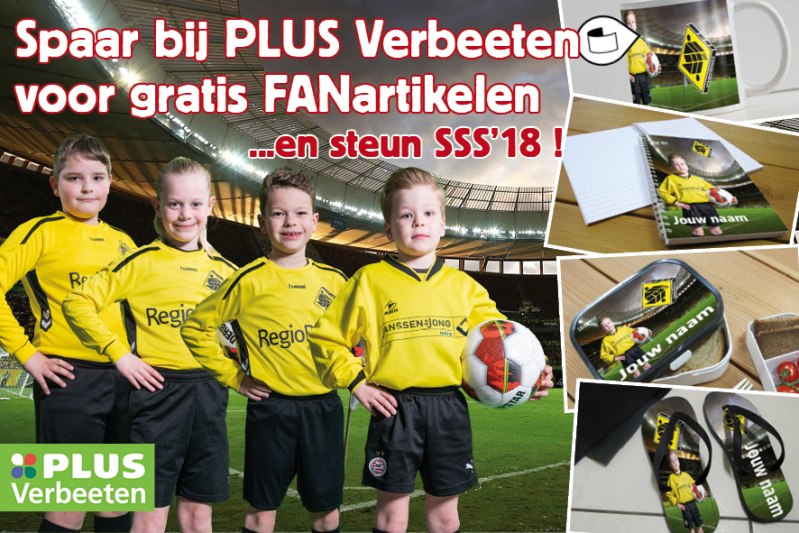 - bij PLUS Verbeeten kun je vervolgens sparen voor gratis fanartikelen: bij iedere € 10,- boodschappen krijg je een zegel. Deze zegels kun je vervolgens in de eigen fanshop verzilveren en daarmee dus sparen voor je eigen fanartikelen. Natuurlijk kunnen anderen ook sparen voor fanartikelen van hun kind, kleinkind of favoriete speler,