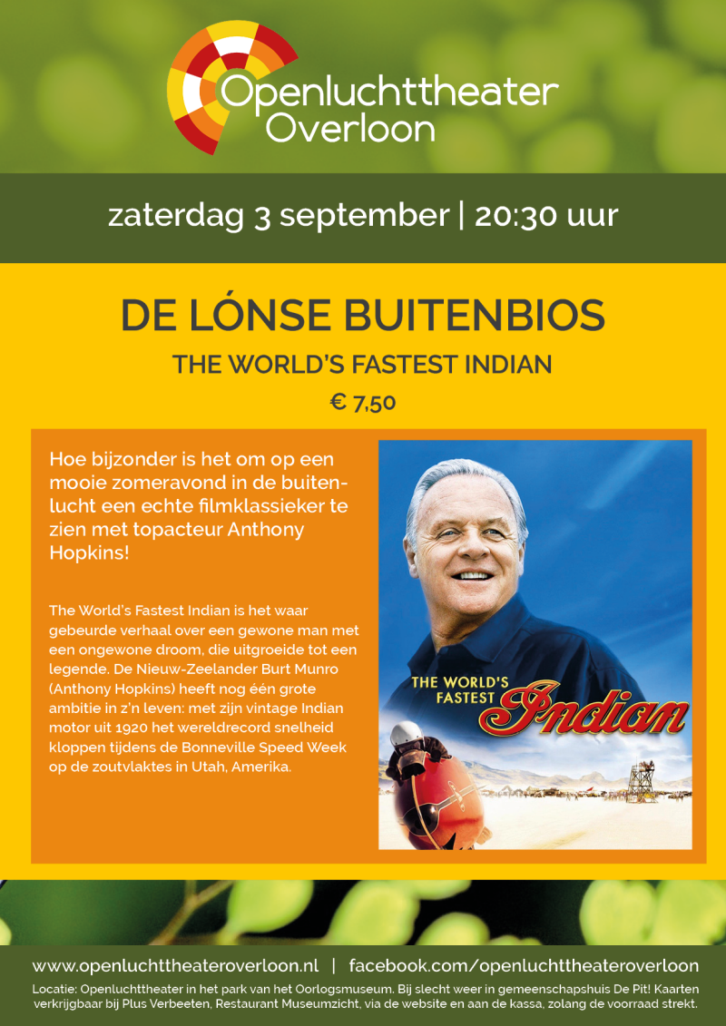 Op deze zaterdagavond maakt Anthony Hopkins zijn opwachting op het witte doek. De film 'The world's fastest indian' staat namelijk op het programma, een echte filmklassieker.