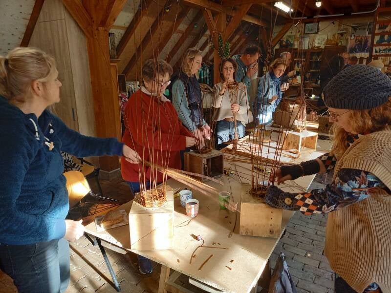 Hierna kon ieder een keuze maken uit diverse vlechtwerken en in groepen begon iedereen te vlechten aan haar of zijn werkstuk. De deelnemers waren erg creatief en de meesten maakten wel drie vlechtwerken zoals winterkoning, nestje, pindakaaspothouder vogelvoedermandje, mand voor bloempot, kerstboompje etc. Een bijzonder gezellige zaterdagochtend waar misschien wel een vervolg op komt