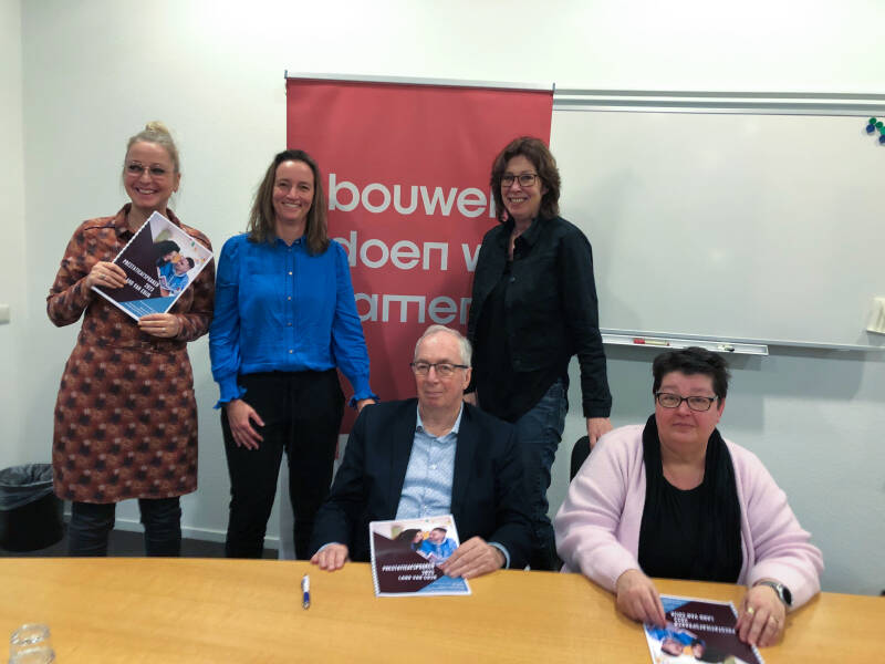 - Foto: Ondertekenaars van de prestatieafspraken: Elly Pansier ,directeur Wonen Mooiland, Bouke de Bruin, wethouder, Joke Abbring, directeur-bestuurder Wonen Vierlingsbeek, Gerrie Knuiman, huurdersplatform Land van Cuijk i.o en Ingrid Reijnders huurderspanel Vierlingsbeek Wonen.