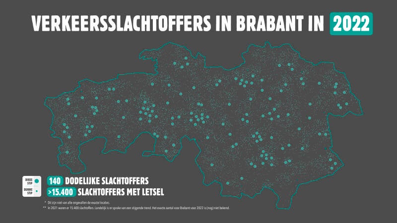 Het aantal verkeersdoden is het topje van de ijsberg. In 2021 belandden in Noord-Brabant meer dan 15.000 mensen op de spoedeisende hulp in het ziekenhuis naar aanleiding van een verkeersongeval. Volgens recente cijfers van VeiligheidNL is er een stijgende trend als het gaat om het aantal verkeersslachtoffers in Nederland. Met name fietsers blijken kwetsbaar.