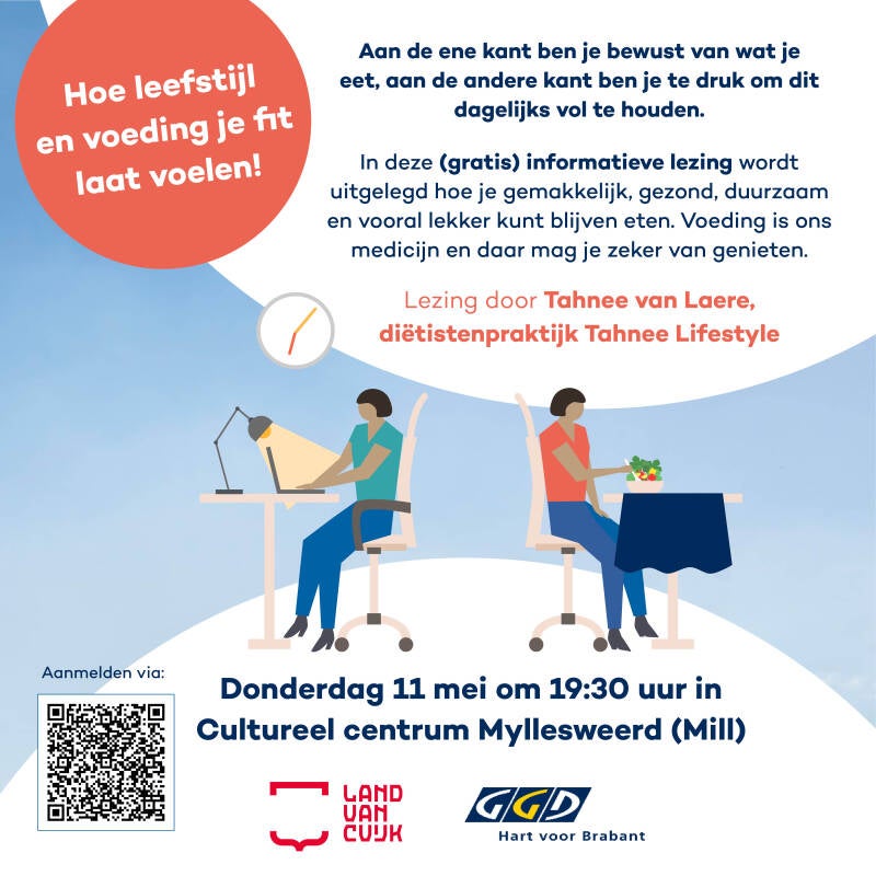 Dit jaar zal GGD Hart voor Brabant in samenwerking met gemeente Land van Cuijk diverse sprekers uitnodigen om te komen praten over het belang van een goede gezondheid en mentale en fysieke fitheid. Op donderdagavond 11 mei is het woord aan Tahnee van Laere, eigenaresse diëtistenpratkijk Tahnee Lifestyle.