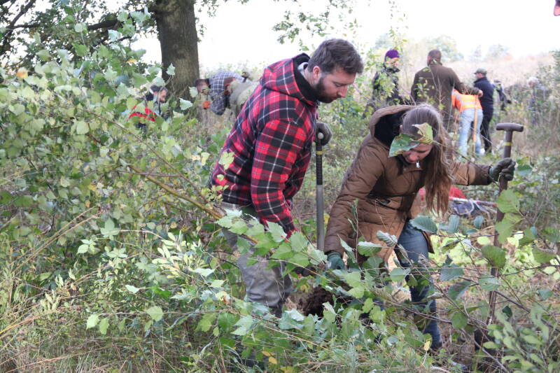 Fotobijschrift: Vrijwilligers steken jonge boompjes uit tijdens een eerdere oogstdag in natuurgebied De Vilt in Beugen