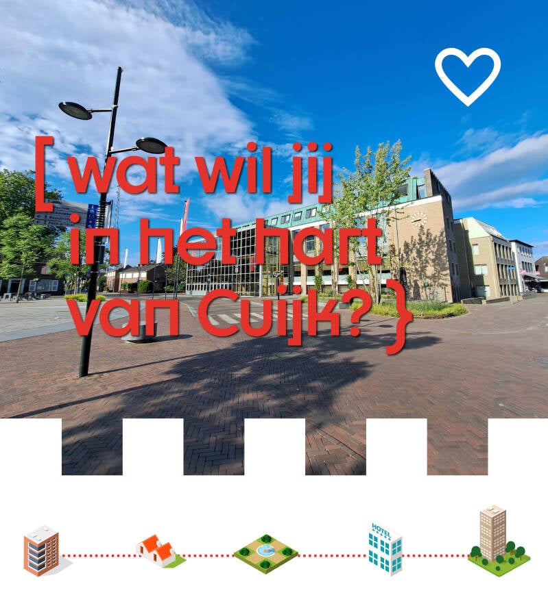 Vanaf 2025 is het gemeentehuis in Cuijk niet meer in gebruik. We zijn heel benieuwd wat de inwoners uit Cuijk, van jong tot oud, het liefst zien op deze plek. Extra woningen zijn in deze tijd natuurlijk voor de hand liggend. Maar voor wie en hoe wil je dat het er uitziet? En misschien leven er wel heel andere ideeën voor deze centrale plek in het dorp. Van bedrijfsverzamelgebouw, een park, een medisch centrum of een combinatie van een aantal dingen. Voordat we gaan onderzoeken wat er allemaal kan, willen we weten wat de wensen zijn, zodat we deze kunnen meenemen in het onderzoek.