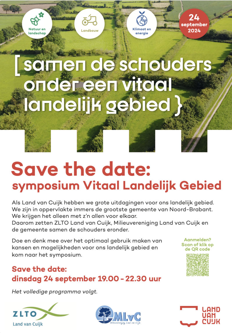 Save the date symposium vitaal landelijk gebied Dit organiseren we samen met ZLTO Land van Cuijk en Milieuvereniging Land van Cuijk.