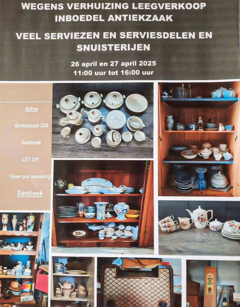 Vanwege een verhuizing wordt de inboedel van een antiekzaak in Sambeek op 26 april en 27 april 2025 in een bijzondere leegverkoop aangeboden.