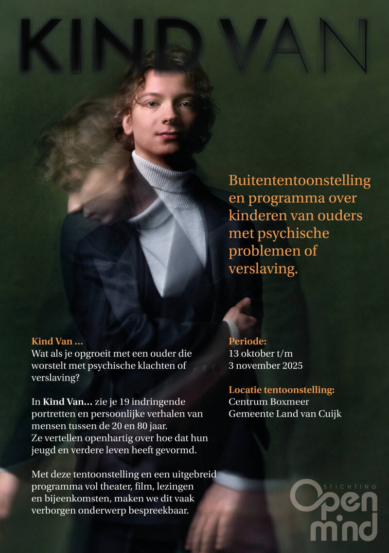 De tentoonstelling ‘Kind Van’ laat de verhalen van deze kinderen zien. In krachtige portretten en korte, eerlijke teksten delen kinderen en volwassenen hun ervaringen. De tentoonstelling is vanaf 13 oktober tot en met 3 november te zien in het centrum van Boxmeer. Tijdens de tentoonstelling organiseren we diverse activiteiten zoals filmavonden, lezingen en tentoonstellingen die uitnodigen tot gesprek.