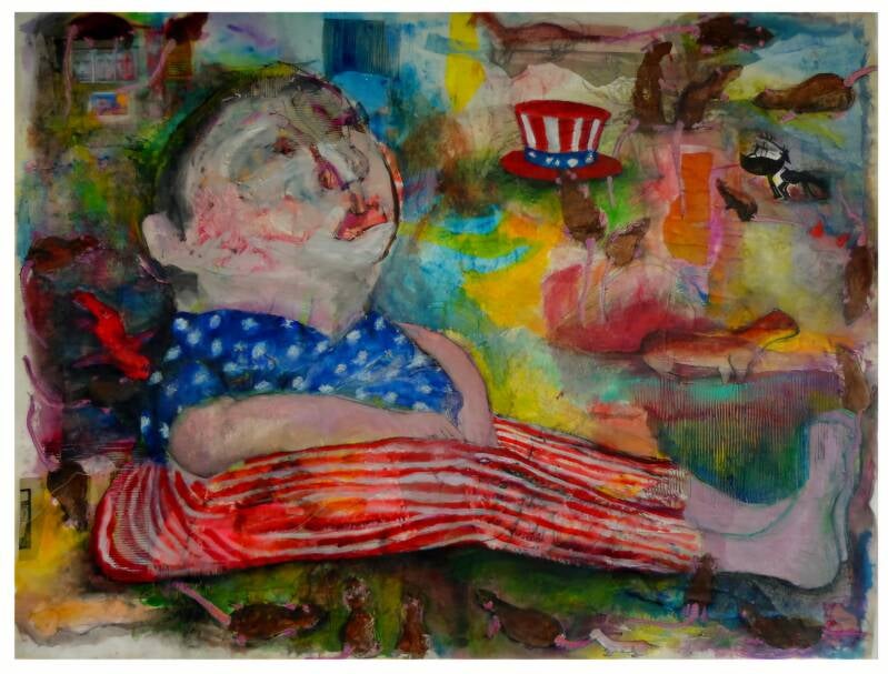 De techniek is collageachtig en haar werk komt in beweging. Geen lijst, wel een rafelrand. De laatste jaren zijn daar ook druktechnieken bijgekomen.