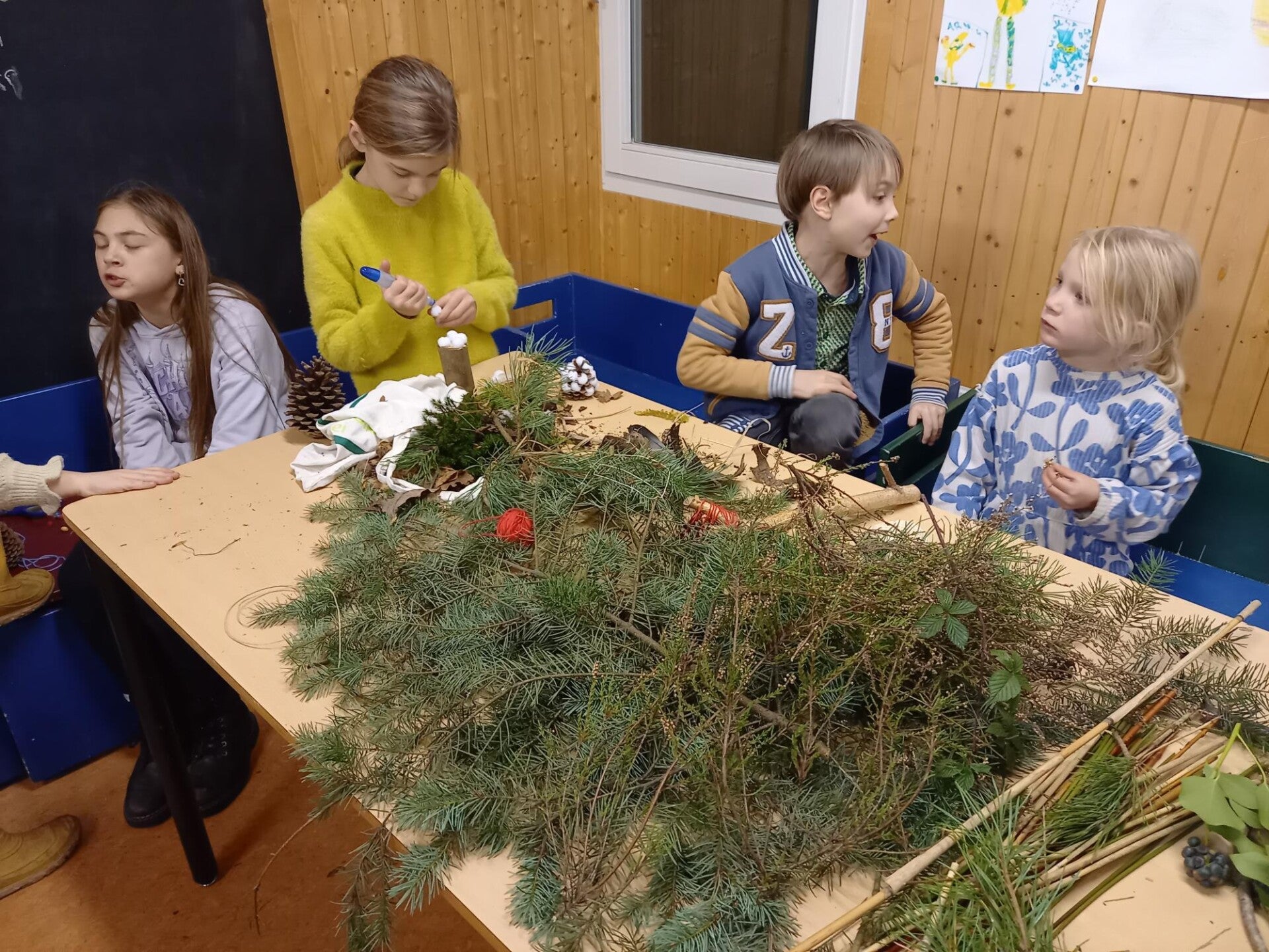 Buigzame takken, brem, heide, dennenappels, pijpenstrootje, hulst, berkentakken etc. Binnen in het clubgebouw werd er al gauw creatief gewerkt om van alle materialen iets moois te maken. Er werd van alles opgehangen aan berkentakken, maar er werden ook kerststukjes gemaakt, dennenappels versierd en kerstkransen van buigzame takken versierd. De ouders kwamen verwonderd binnen om zoveel mooie creativiteit van hun kinderen te zien. ouder reageerde spontaan: "Dit doen de kinderen zo graag, ze kijken nu al uit naar 14 januari, wanneer ze mogen vlechten met wilgentenen." Groeten, Jac