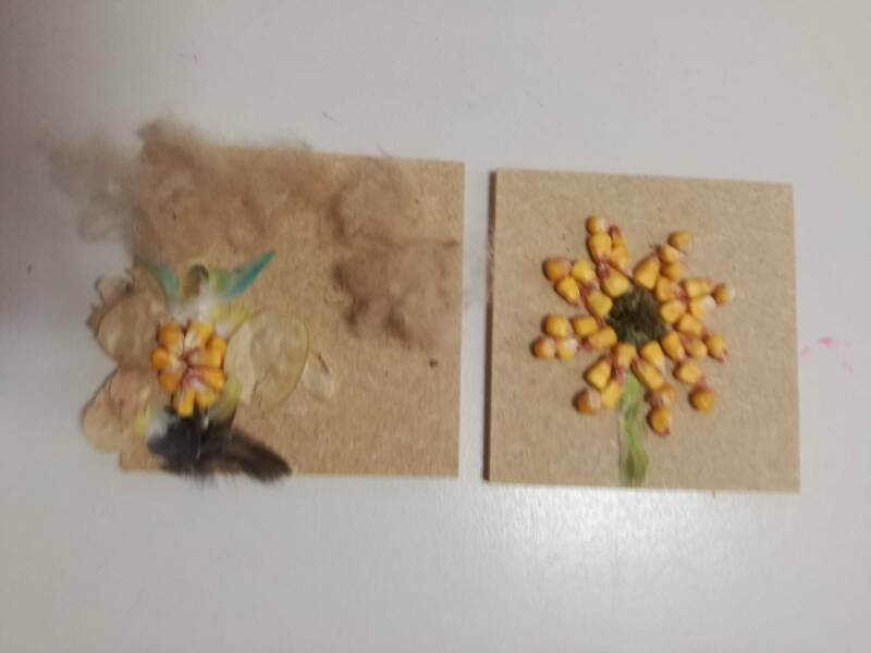 Dat plaatje hout smeer je in met houtlijm, niet te zuinig zodat de zaadjes goed kunnen plakken Je kunt zaadjes gebruiken van de mais, kleine en grote bonen, erwten, granen en misschien zijn er in de bloementuin ook nog leuke zaaddoosjes of gedroogde bloemen te vinden die je kunt gebruikenVeel succes en groetjes Jac
