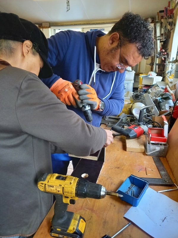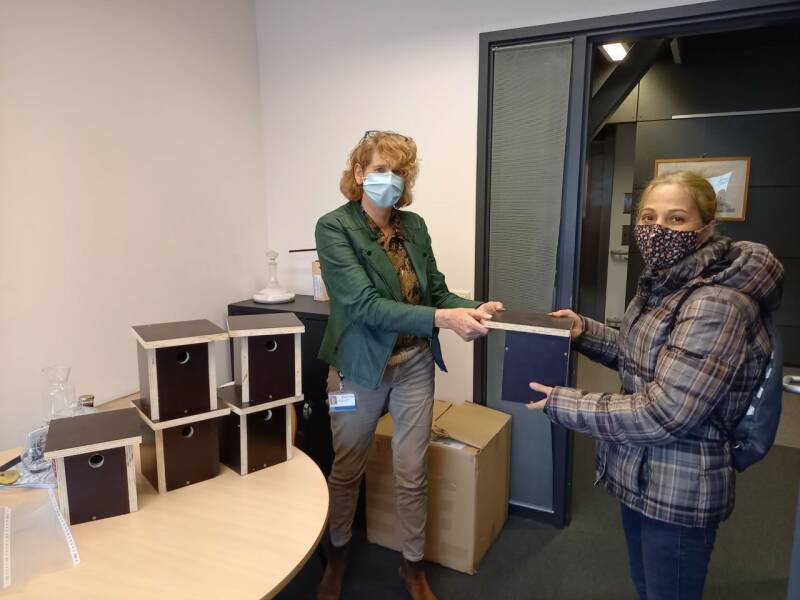 Mevr. Azar en Hr. Mehdi, beiden uit Iran, kregen het materiaal en gereedschappen aangereikt en vol ijver gingen zij aan de slag. Het resultaat mag er zijn, keurig voorgeboord en geschroefd, zijn de nestkasten op NL-doet dag aangeboden door Gerry Janszen van Zorgcentrum 't Hoogveld aan Zorgcentrum De Lookant in Wanroy