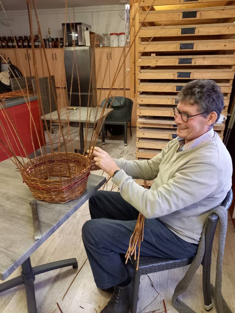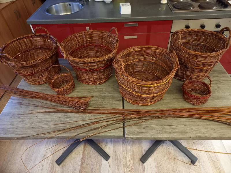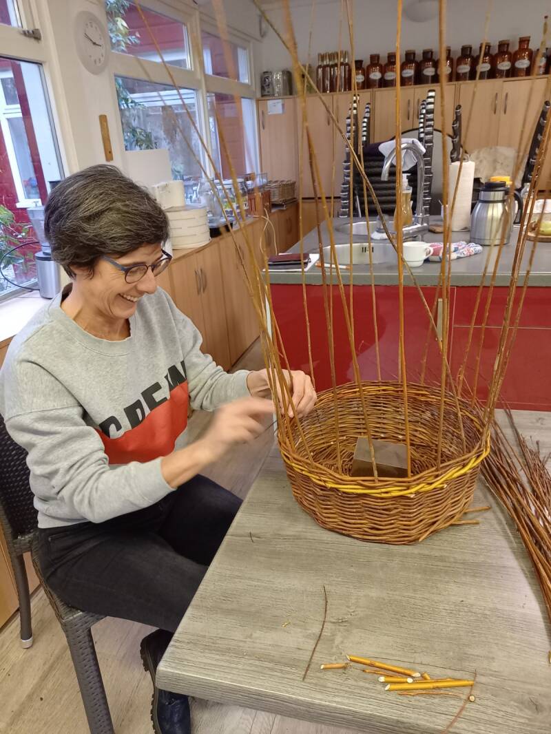 Zij wilden graag het aloude ambacht "Manden vlechten" leren Na een introductie door Jac de Cock werd de bodem gevlochten De weken erna werden de staken opgezet, Franse neer gevlochten kimmen gelegd en de Hollandse Neer gevlochten De bodem werd extra versterkt en de oren (handgrepen) aangebracht Twee dames hebben creatief gevlochten, een vlinder, mandje, hartje etc Met veel plezier en de nodige kennis ging men heel tevreden huiswaarts