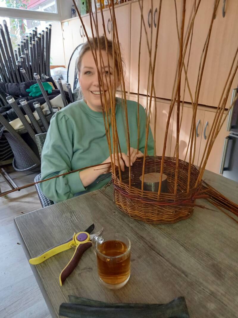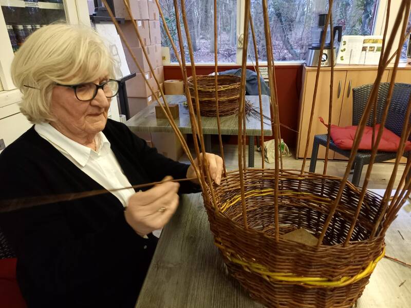 In groepen van 8 a 10 personen geef ik les op 4 zaterdag middagen in het najaar en soms ook nog in het voorjaar. Na het verhaal over de wilg wordt de bodem gevlochten, dan de staken ingestoken/opgezet en gevlochten, waarna de randen gelegd en bodemkim De laatste middag worden oren en beugels aan de mand gezet Een bijzondere vlechtster is Mies die met haar 81 jaar niet achterblijft bij de andere cursisten, knap werk!