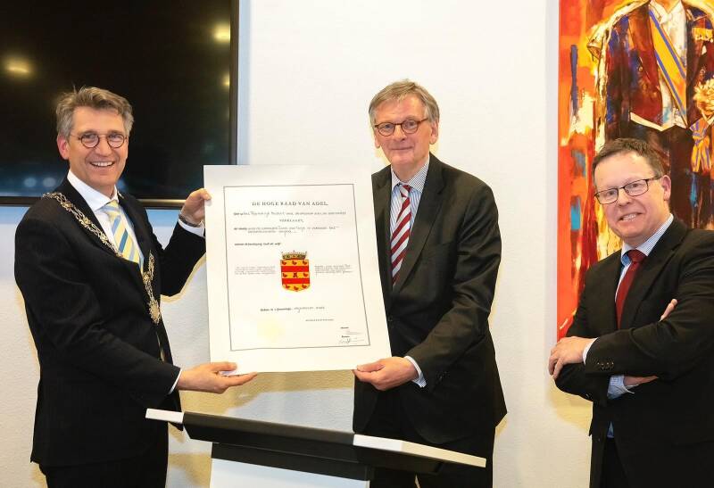 Foto bijschrift: Overhandiging wapendiploma. V.l.n.r. Waarnemend burgemeester Hillenaar, jonkheer mr. J.P. de Savornin Lohman en drs. J.C.C.F.M. van den Borne (beiden verbonden aan de Hoge Raad van Adel als resp. voorzitter en medewerker advisering / heraldisch medewerker).