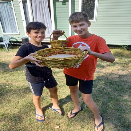 Een groepje kinderen wilde leren te vlechten en zittend op het gras ontdeden ze de wilgentakken van het blad. In een cirkel gingen de takken in de grond en kon het vlechten beginnen. Na een klein mandje wilden ze een grotere mand vlechten Na een paar uur waren ze trots op het resultaat .een klein mandje met boog en een grote fruitmand. Een gezellige middag met veel voldoening voor ons allemaal